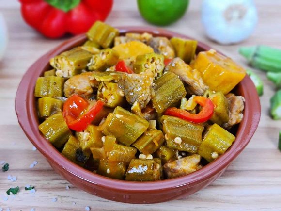 Veinte quimbombó hechos, 2 cucharadas de manteca de puerco, 6 dientes de ajo, 1 hoja de laurel, 2 cebollas, pimienta y sal a gusto.